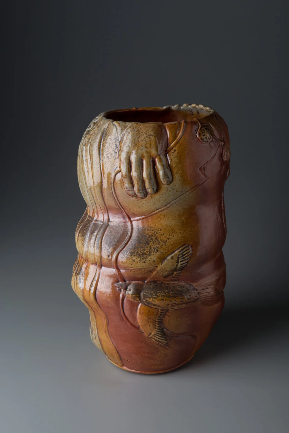 Reaching for Green Wood Soda Fired Vase with Figure Forms and Grid Textures
