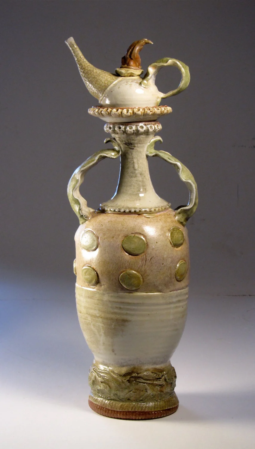 One of a kind, handpainted, wood fired porcelain vessel, wheel thrown with hand sculpted additions as handles and foot. Saucer and companion teapot are hand thrown with hand sculpted additions as handles, edges and lid. This piece was wood fired, then electric fired with china paint to add the subtle color. It is 22" tall x 8" wide x 6" deep. The teapot and saucer are stand alone forms that can be set to the side of the vase form as it is used for it's functional purposes. Wonderful piece that I count as one of the treasures that has come out of my kiln firings. It is a featured piece in: 100 Northwest Artists, Author: Ashley Rooney, Publisher: Schiffer Publishing Ltd., 2013.